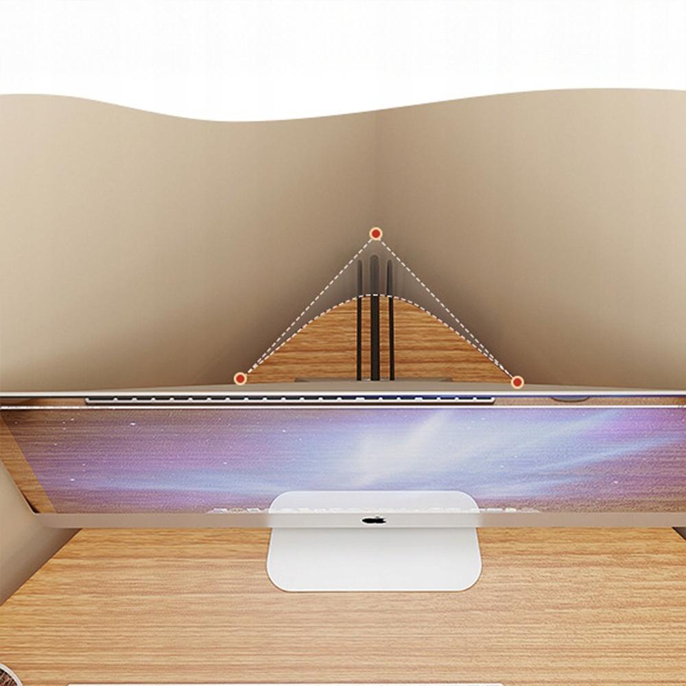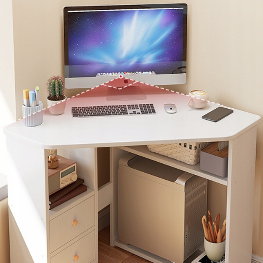 Acest birou triunghiular de colț este ideal pentru apartamente sau birouri mici. Se potrivește perfect în colțul unei camere, economisind spațiu fără a compromite funcționalitatea. Suprafața sa de lucru spațioasă și rafturile încorporate oferă organizare eficientă și confort pentru utilizarea zilnică.