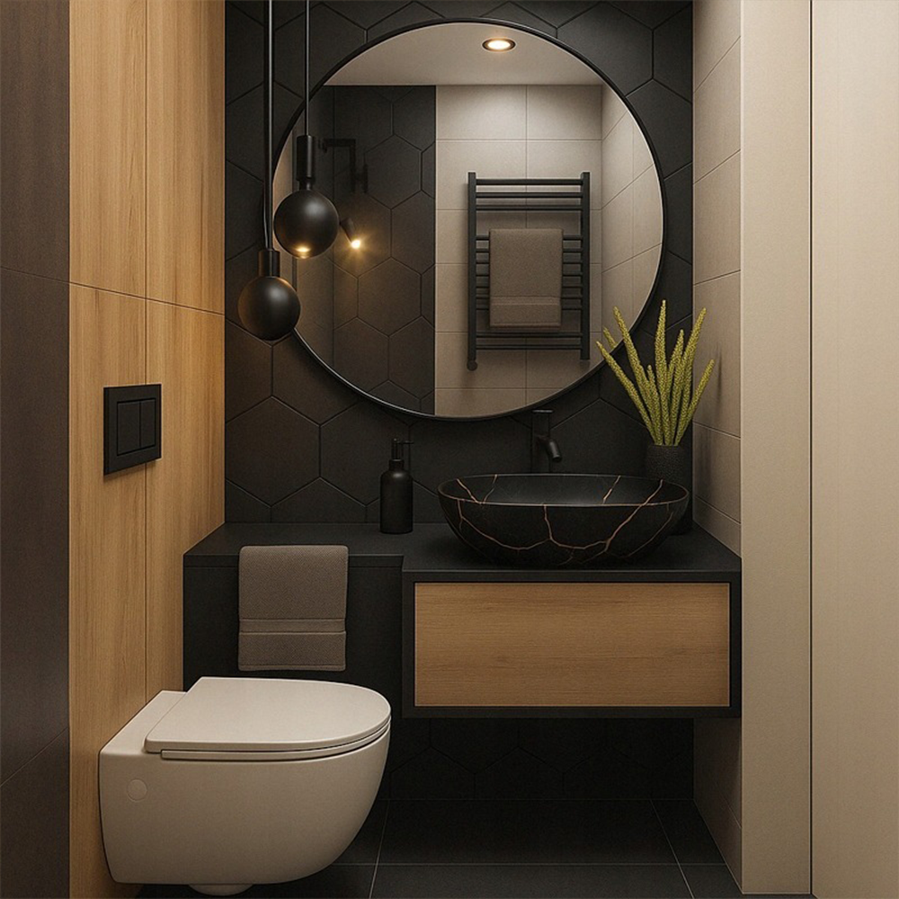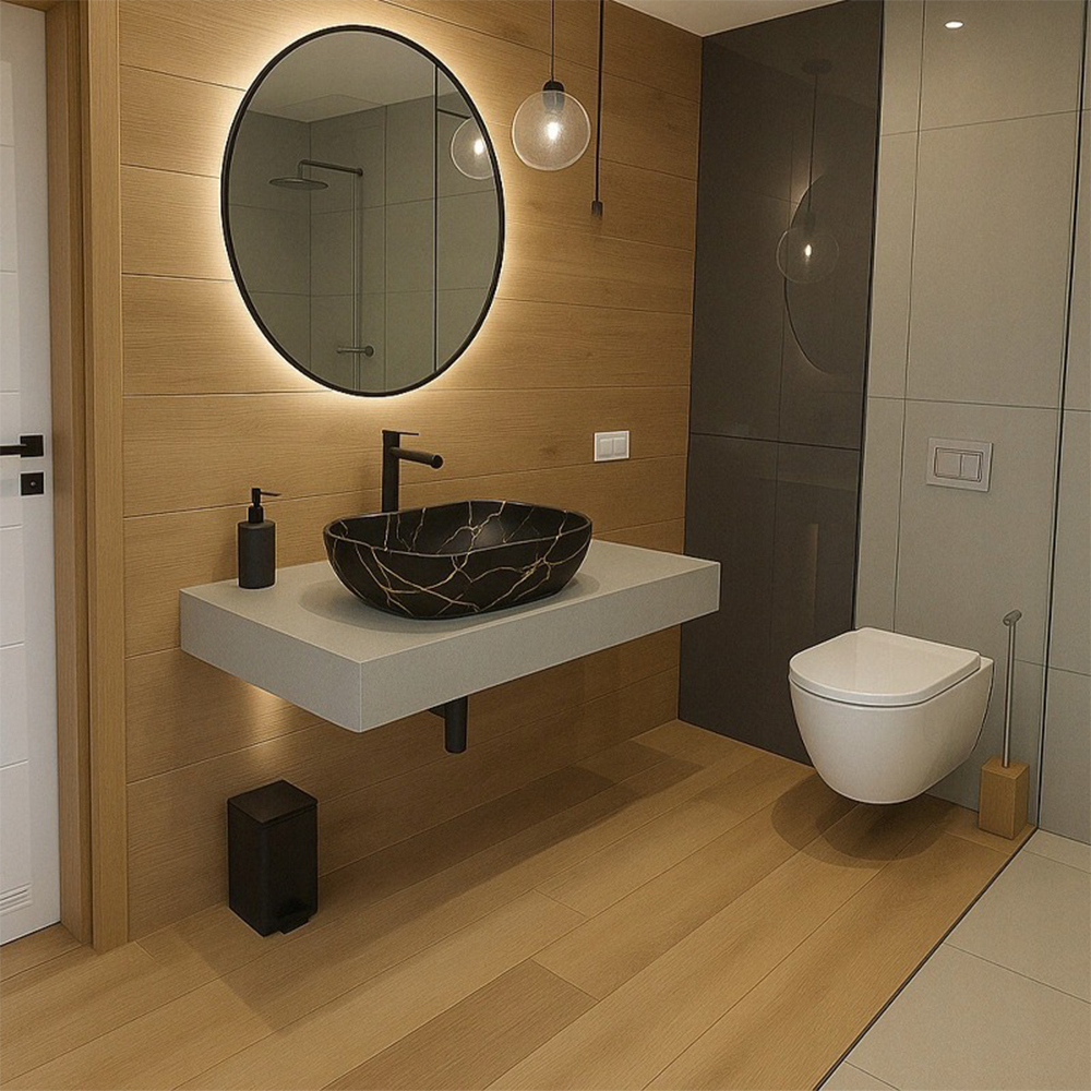 Transformă-ți baia într-un spațiu elegant și rafinat cu acest lavoar montat pe blat, realizat din ceramică sanitară, cu finisaj negru mat și efect de vene aurii tip marmură. Datorită dimensiunilor sale compacte (46,5 × 33 × 13,5 cm), este alegerea ideală pentru băi moderne, minimaliste sau de inspirație luxoasă.