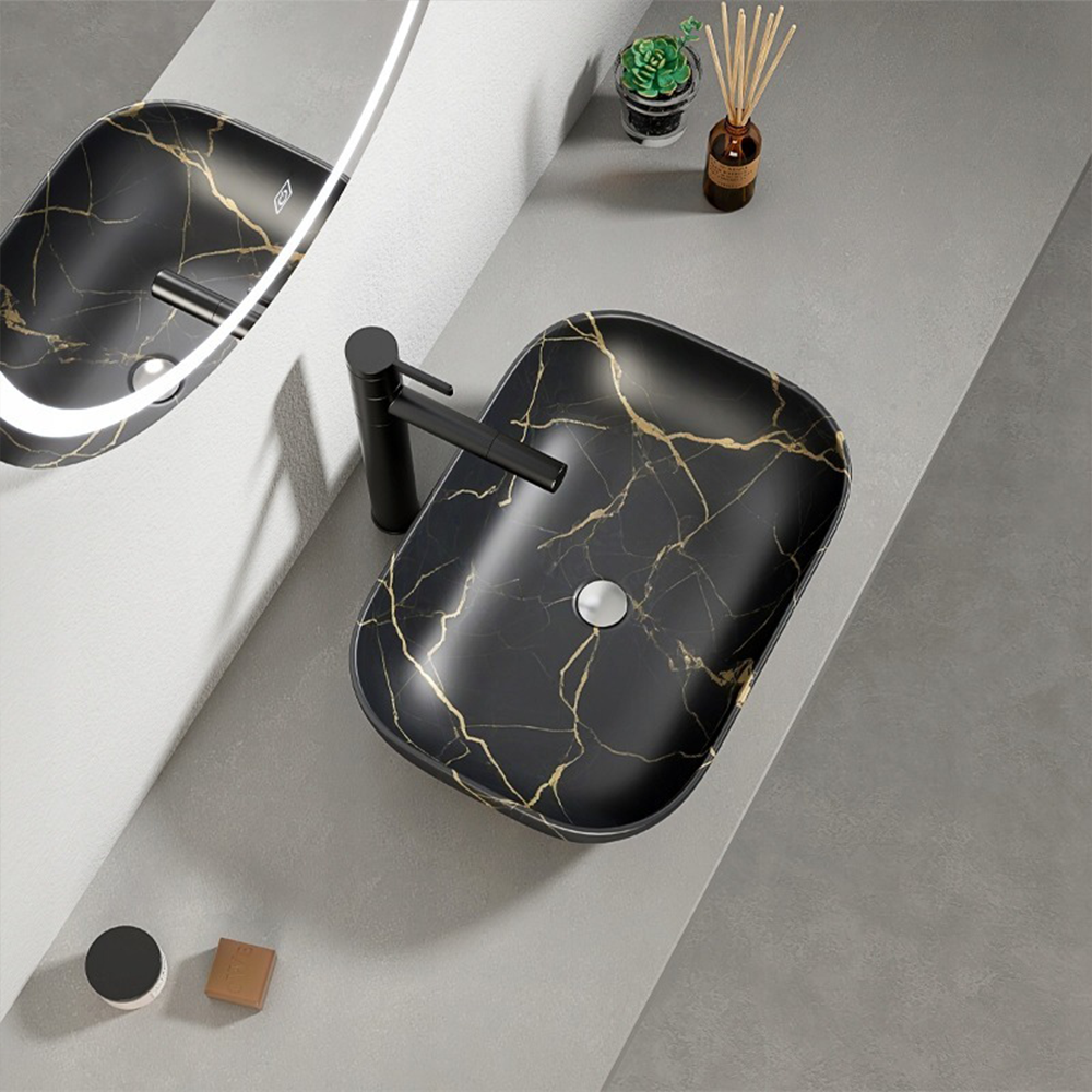 Fabricat din ceramică de înaltă calitate, lavoarul este rezistent la zgârieturi, pete și temperaturi ridicate. Inspirația din marmura naturală, cu vene aurii, conferă un aspect sofisticat și exclusivist băii tale.
