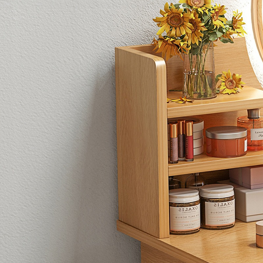 Această măsuță de toaletă rotundă cu oglindă este o alegere ideală pentru dormitoare sau băi în stil modern, clasic sau rustic. Finisajul în nuanță de fag deschis (efect de lemn natural) oferă mobilierului un aspect cald, tradițional, care se integrează fără efort într-o varietate de interioare.
